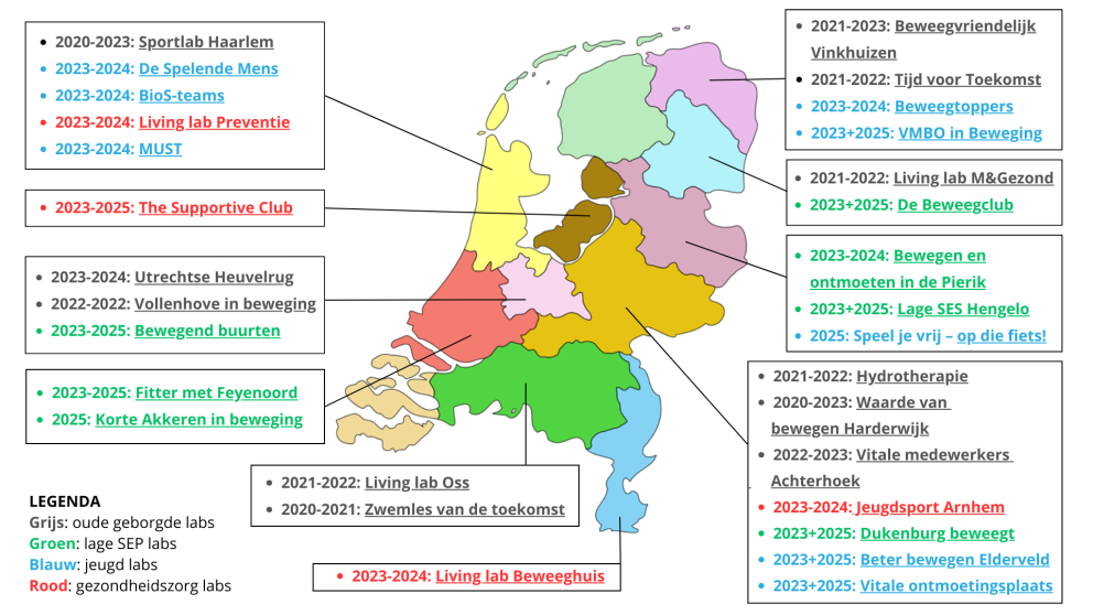 Samen met ZonMw hebben we de afgelopen jaren gebouwd aan een sterk netwerk van living labs sport en bewegen. Momenteel bestaat het netwerk uit 33 lokale living labs verspreidt over heel Nederland. 27 van deze labs zijn gefinancierd door ZonMw en/of Sportinnovator.
