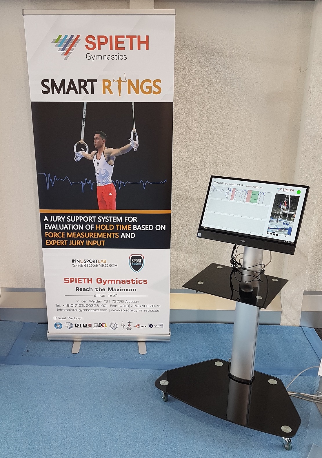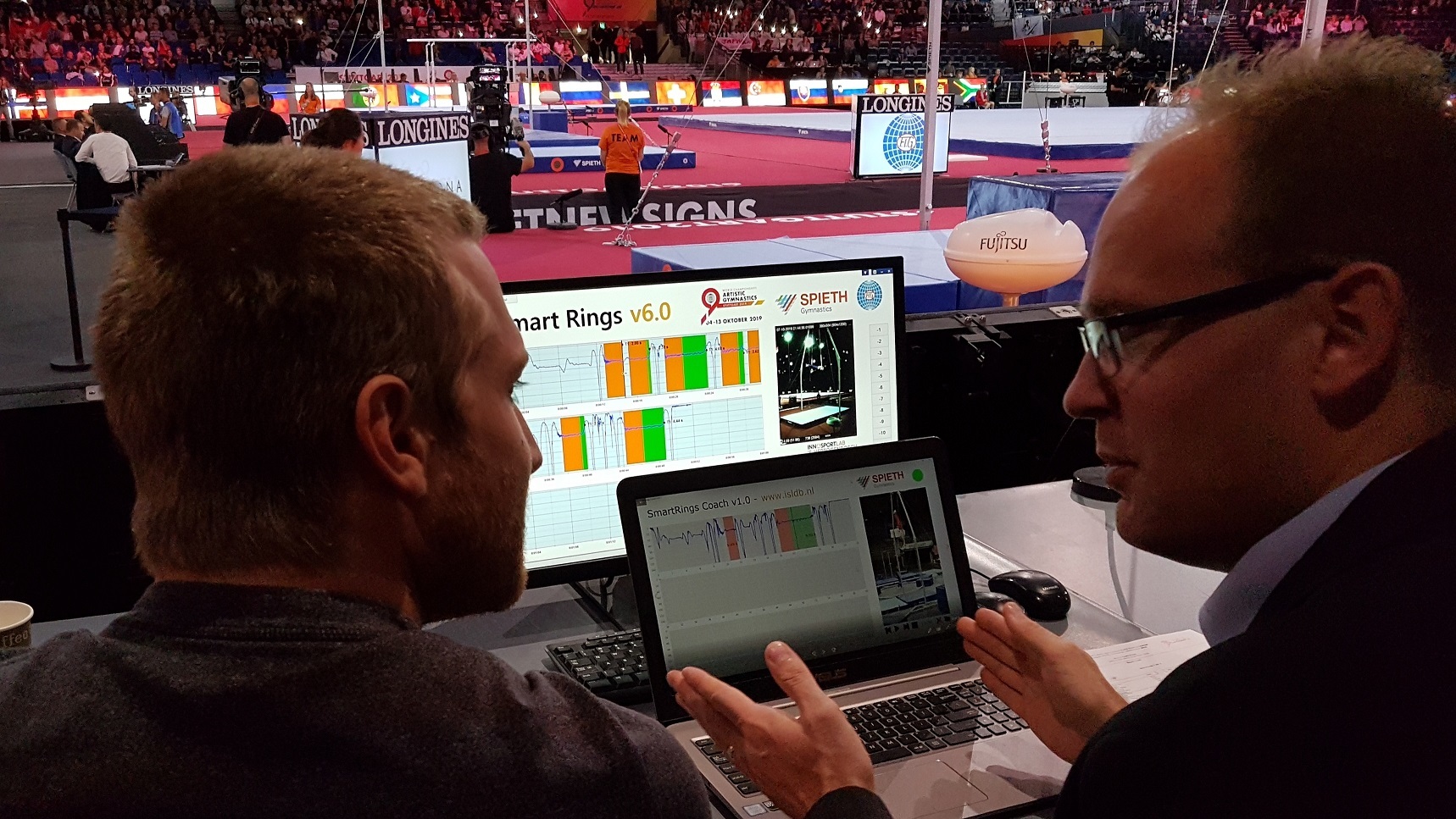 “Het begon eigenlijk al in 2016, toen we met de Smart Rings Toolbox de Sportinnovatieprijs wonnen”, steekt Aarts van wal. “In die toolbox zit een aantal dingen. In een notendop komt dat neer op ringen die normaal ook bij turnen worden gebruikt, maar dan met sensoren erin verwerkt. Die sensoren zorgen ervoor dat bij het turnen, dat een jurysport is, objectiever kan worden gescoord. Het prototype waarmee we de prijs hebben gewonnen heeft uiteindelijk geleid tot een product dat op de markt is gebracht. Een product dat voor coaches en sporters in traininscentra kan worden gebruikt, maar bijvoorbeeld ook hier op het WK turnen en Stuttgart.”