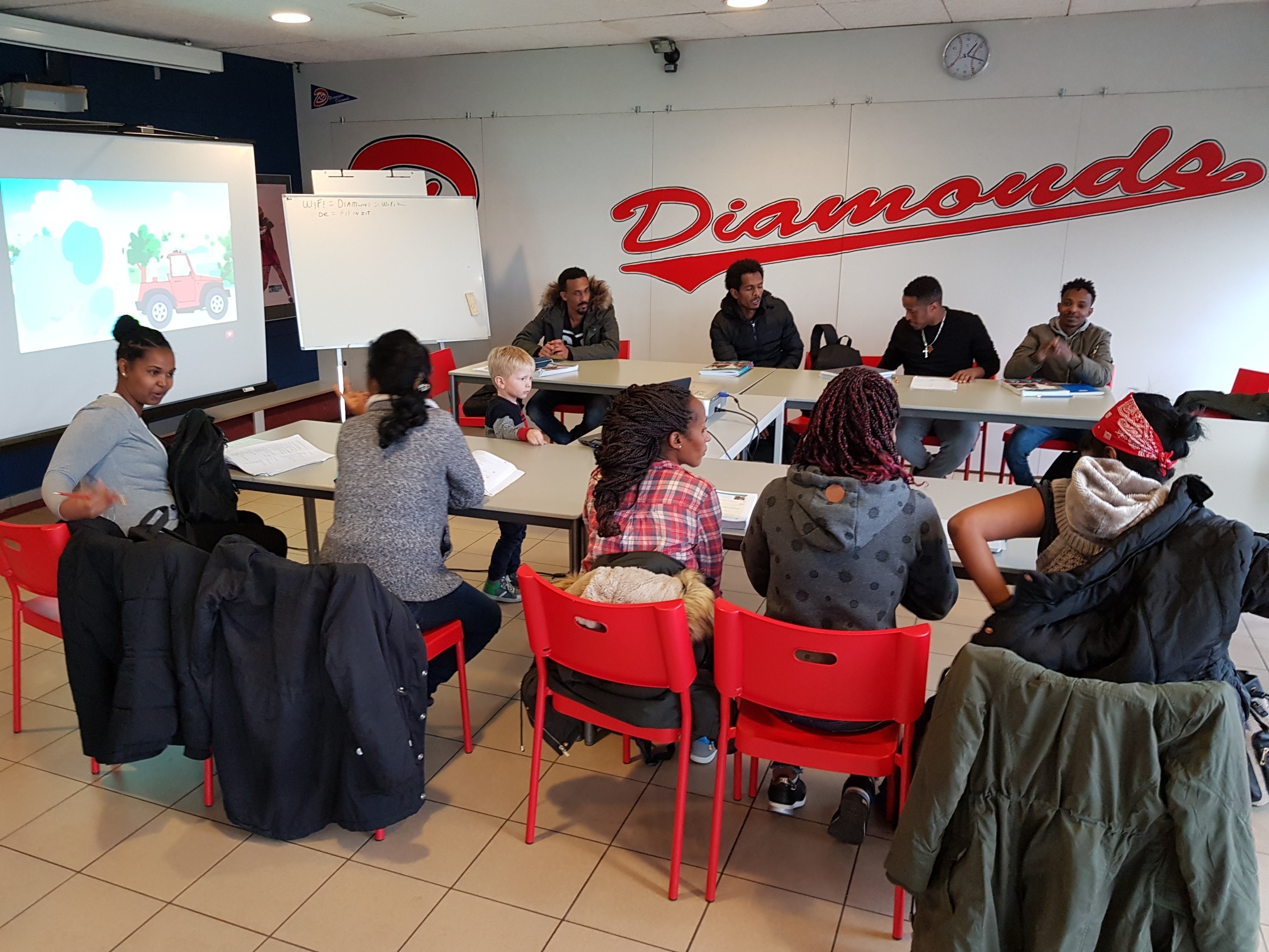 Poelman ging ook het gesprek aan met de coördinator van Steunpunt Vluchtelingen Nieuwegein. De coördinator had als doelstelling om meer mensen in beweging te krijgen, wat geheel in lijn licht van de doelen van SportID. ‘Uit die gesprekken kwam naar voren dat zij niet veel te doen hebben, maar wel taallessen volgen. Dat is voor hen een verplichting voor de inburgering, dus daar lagen kansen. We zijn toen begonnen met een pilot van één taalklas. Zij krijgen anderhalf uur les, gaan daarna een halfuur bewegen om vervolgens af te sluiten met weer anderhalf uur les. Die lessen volgen ze in de kantine van de honkbalvereniging. Dit ging zo goed en de leerlingen vonden het zo leuk dat er daarna twee taalklassen zijn ondergebracht op het sportpark.’