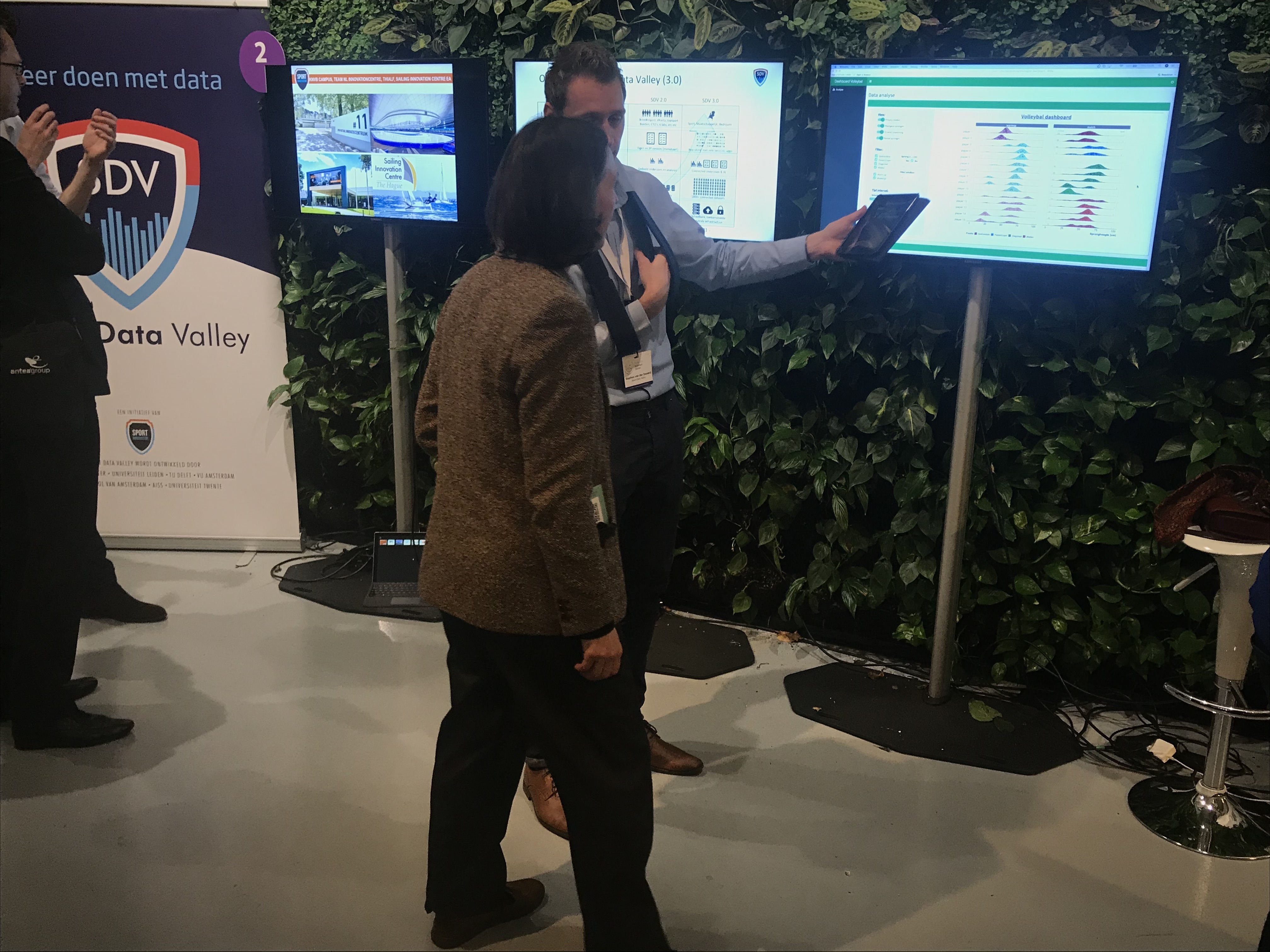 Inmiddels is staatssecretaris Mona Keijzer ook komen kijken. Ze neemt alle informatie gretig tot zich, maar de behoefte om zelf te schaatsen of springen heeft ze niet. “Kijk wat voor hakken ik aanheb. Dat gaat niet samen. Maar ik vind het mooi om te zien hoe ontwikkeld deze innovaties zijn. Ik heb sporten hoog in het vaandel staan en probeer iedere dag dertig minuten te bewegen. Via mijn Fitbit registreer ik precies wat ik doe en kan mijn prestaties daardoor vergelijken met anderen. Dat doet Sport Data Valley ook. Onderlinge competitie zorgt ervoor dat er meer mensen gaan sporten.”