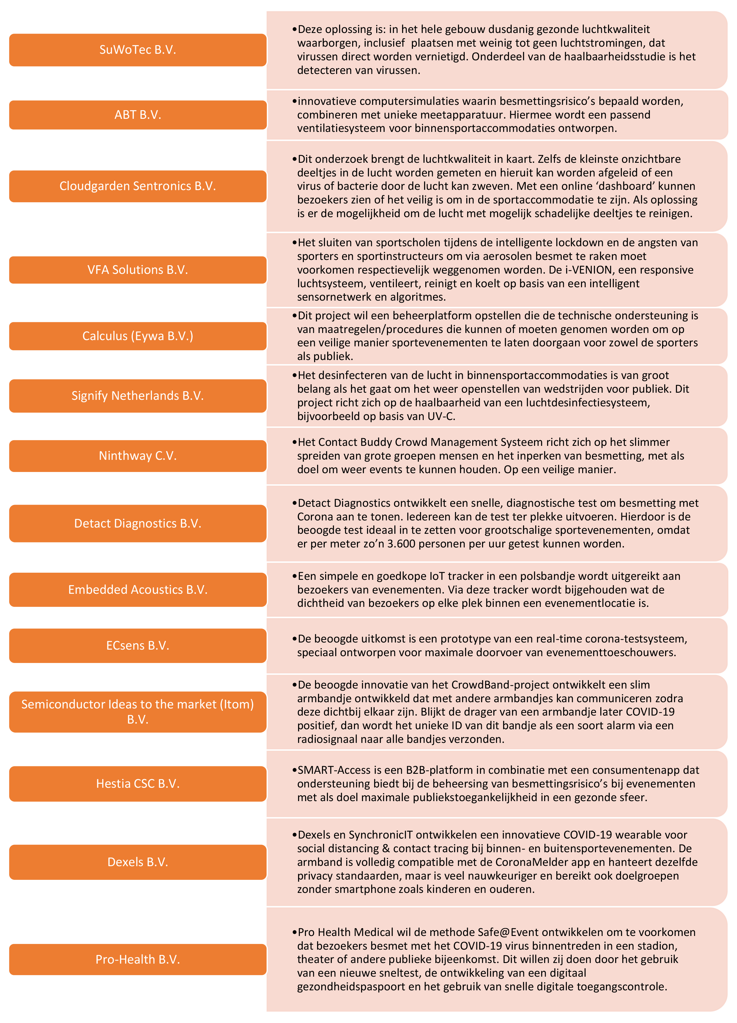 De winnende innovaties bij de SBIR Sportaccommodaties richten zich op de uitdagingen rond hygiëne en luchtkwaliteit in binnensportaccommodaties. De winnende innovaties bij de SBIr Sportevenementen richten zich op triage (onder andere sneltesten) en risicobeheersing met betrekking tot bezoekersstromen (tracken en tracen).